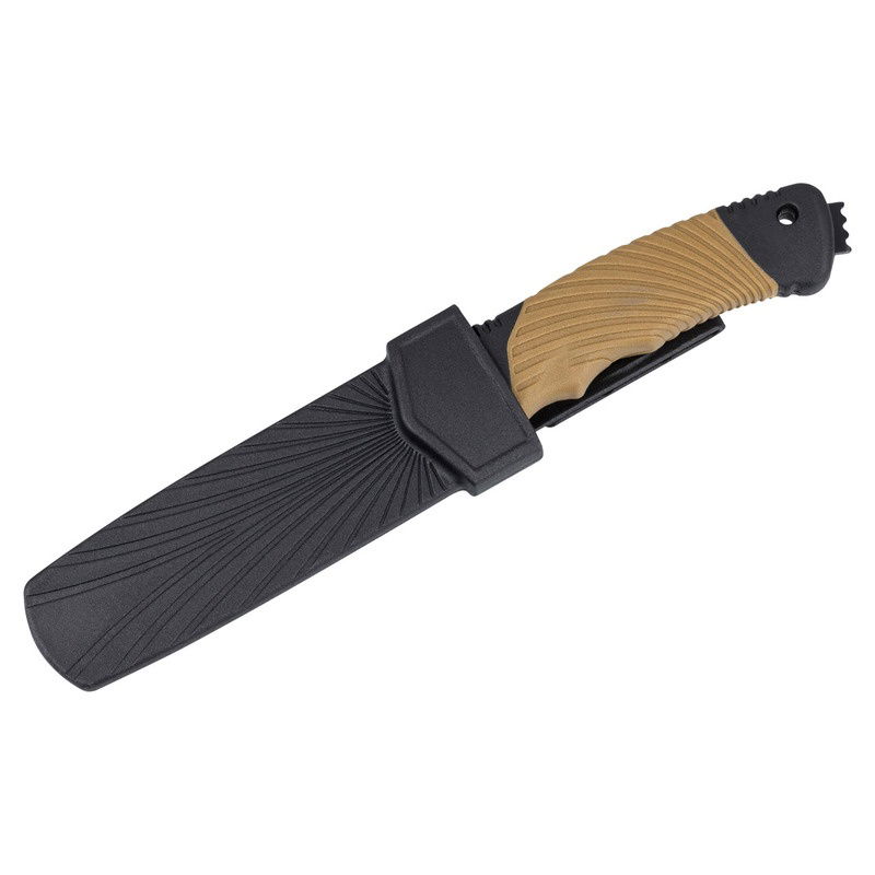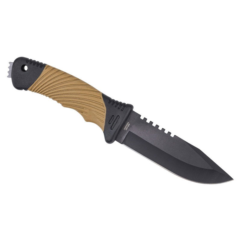 Med denna modell erbjuder CJH en robust friluftskniv med ett blad i 420 rostfritt stål för dagligt bruk. Handtaget, tillverkat av en halkfri kombination av plast och gummi, garanterar ett säkert grepp. En glaskross är integrerad i handtaget som en extra bonus. Ett plastfodral ingår för förvaring och transport.