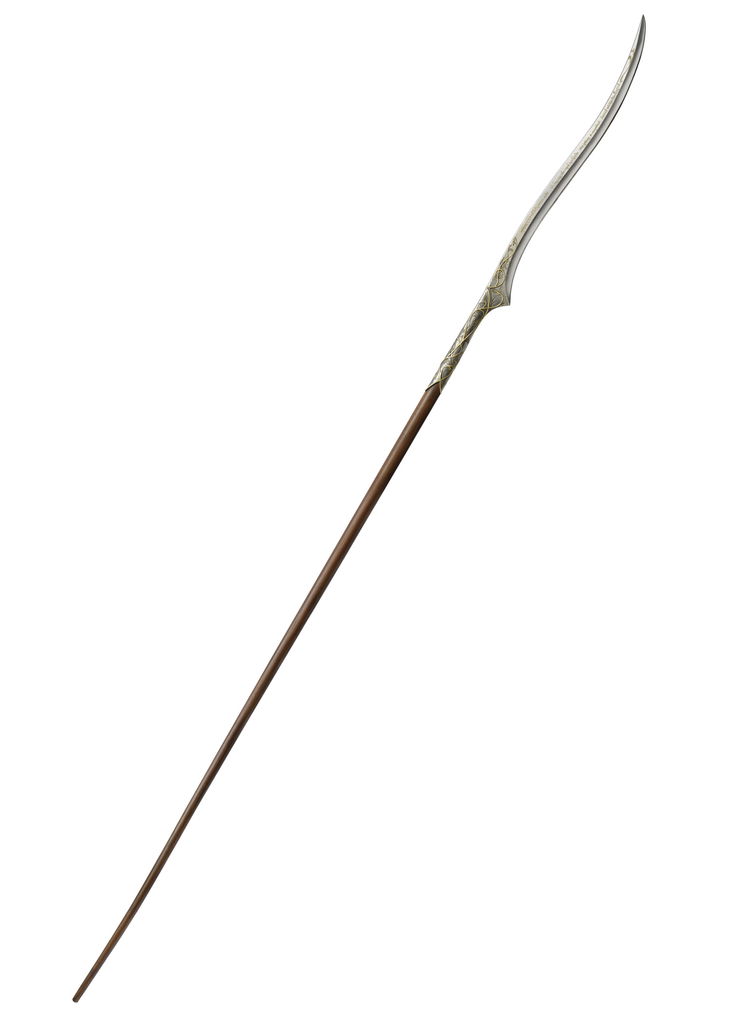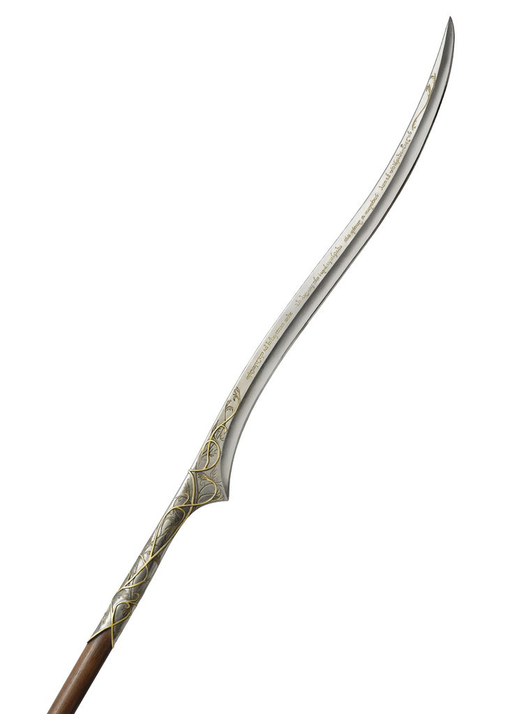 This authentically detailed collectible is an officially licensed reproduction of the spear wielded by Gil-galad in the Lord of the Rings film trilogy. United Cutlery, the industry leader in fine film reproductions, has meticulously recreated the actual prop using only the highest quality materials and craftsmanship. Meticulous attention to detail was a top priority. This exact replica measures approximately 8 feet (2.59 meters) in total length. The blade is made of cold cast polyresin with a steel finish and is adorned with Elvish runes and intricate vine patterns. The handle is made of wood and comes in two pieces. The included wall stand adorned with the Gil-galad seal makes this a fantastic collector's item for all Tolkien enthusiasts.