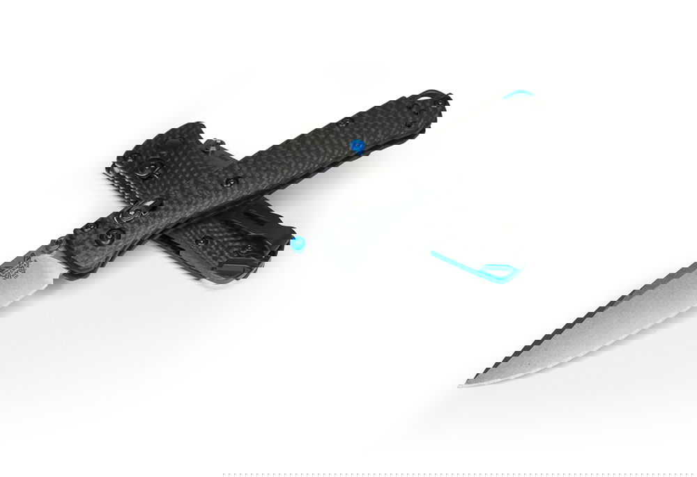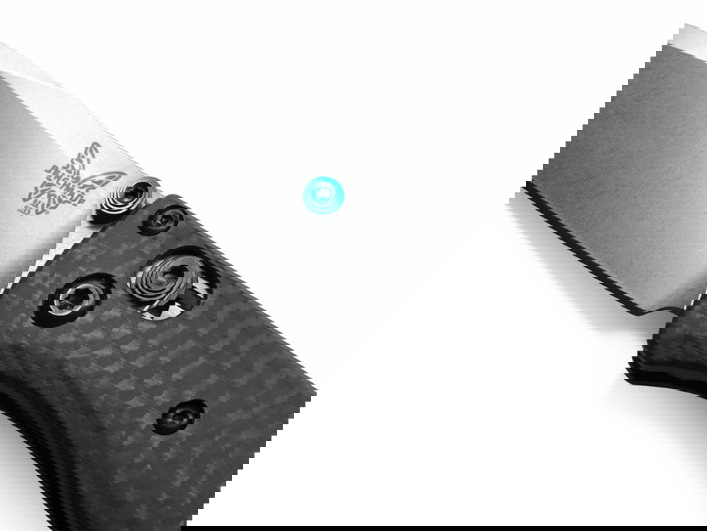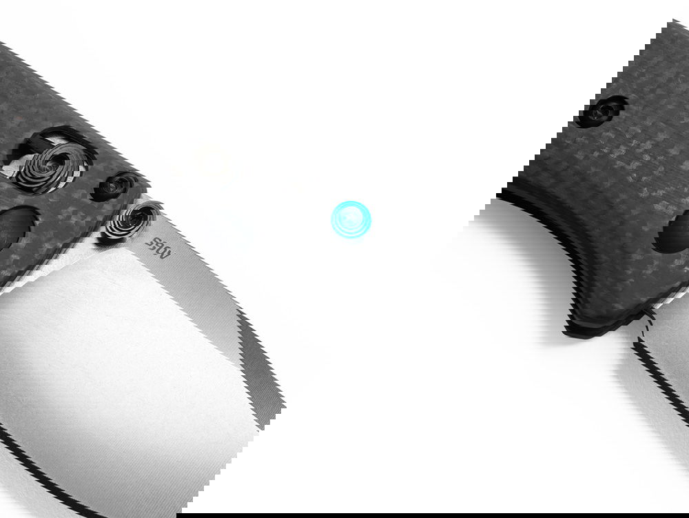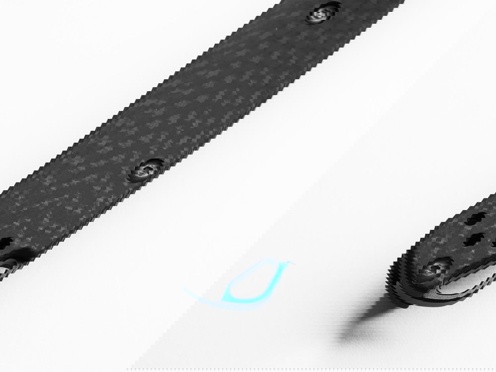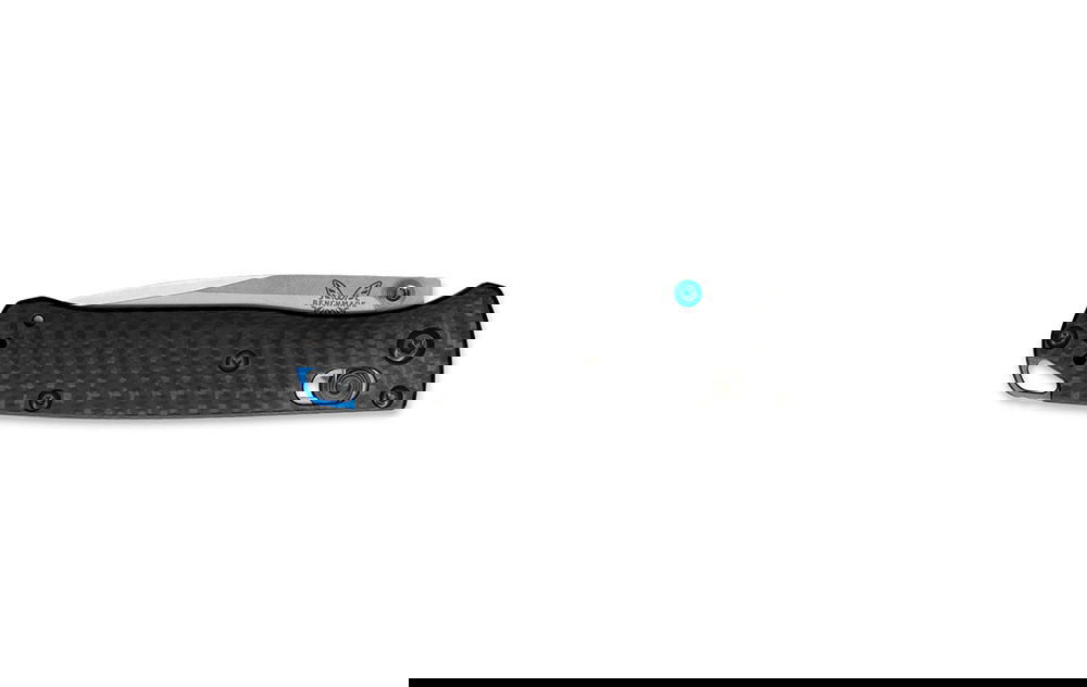 Benchmade 533-3 Mini Bugout har ett oslagbart CPM-S90V superstål och ett fräst kolfiberhandtag med en blå eloxerad back-spacer.