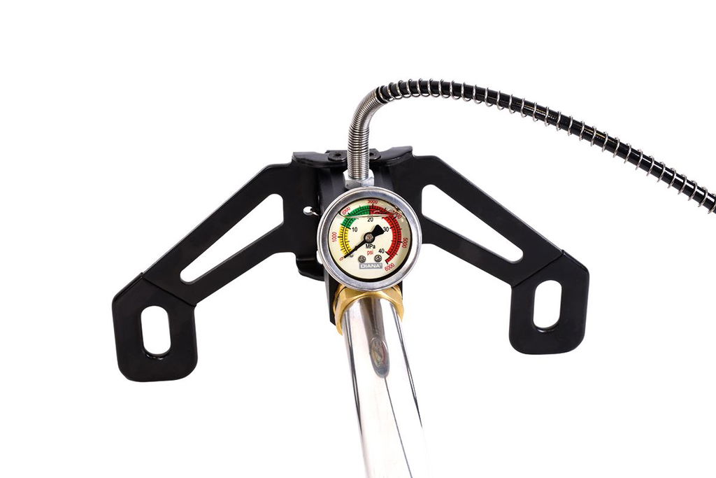 Dianas handpump för pcp gevär har en 1/8" BSP snabbpåfyllningsadapter, ett hopfällbart stativ och en tryckmätare med fluorescerande vätska.