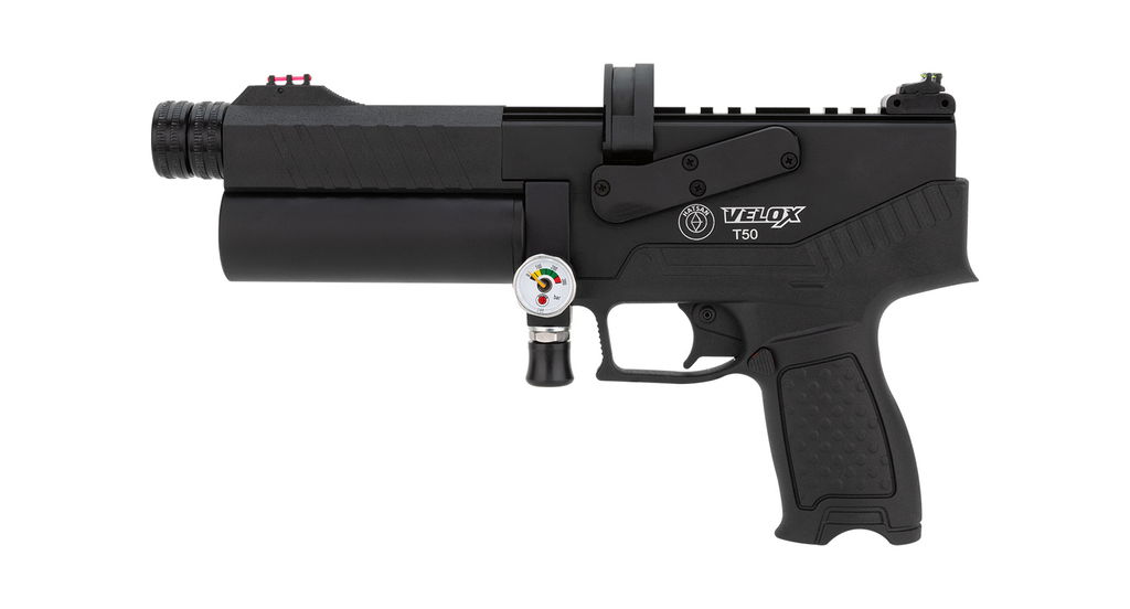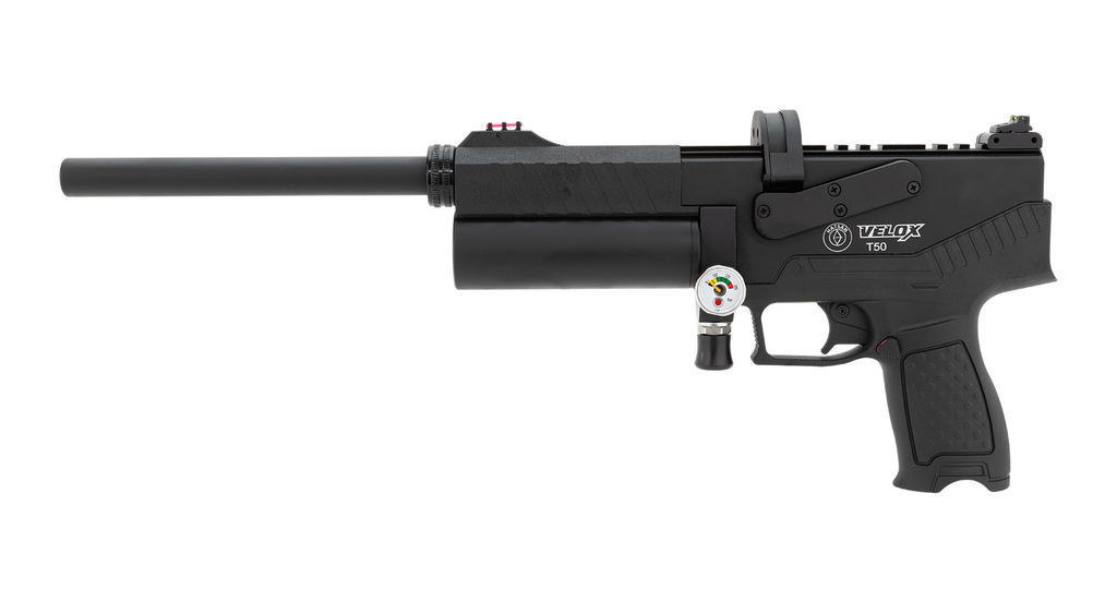 Hatsan Velox T50 är en kraftfull semi-automatisk PCP-pistol designad för att skjuta kaliber .50 gummikulor. Den har ett 5-skotts roterande magasin, ett hållbart polymerhölje, samt fiberoptiska främre och bakre sikten.
