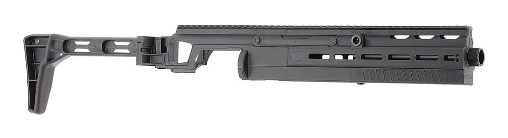 Optik kan fästas på den långa Picatinnyskenan, och ytterligare M-LOK-spår ökar kompatibiliteten med vanliga tillbehör som benstöd, laser och lampor. Totalt tre Quick-Detach-fästpunkter (QD) kan användas för att fästa bärremmar, till exempel.